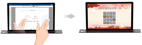 系統支持強制性同屏和選擇性同屏兩種方式,同屏不卡頓、無延時。PC會議終端與平板會議終端之間可跨平臺畫面同屏,并支持4K超高清視頻同步播放。另外會場中間的17席可升降會議終端支持手勢觸摸控制顯示屏切換畫面:在其他參會者分享的同屏畫面和自身的畫面之間,可通過雙指觸摸滑動的方式來實現畫面的來回切換。