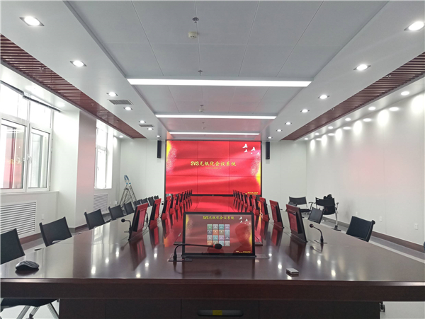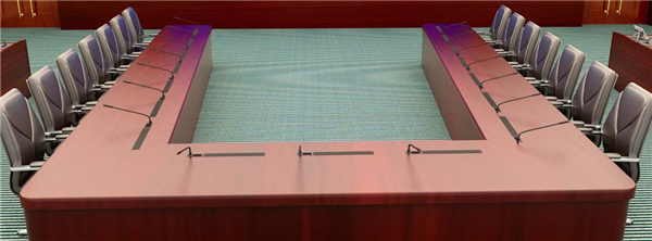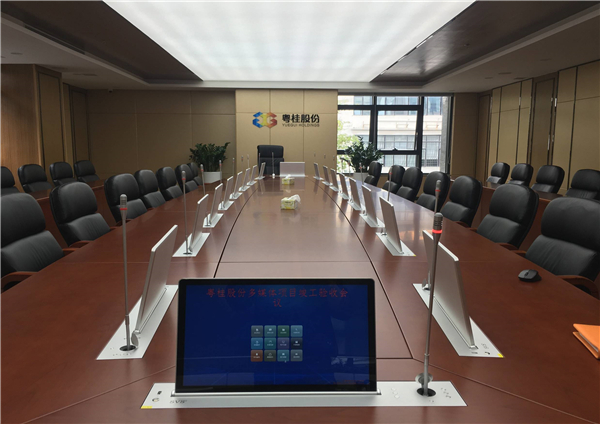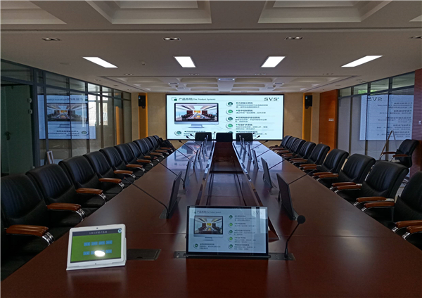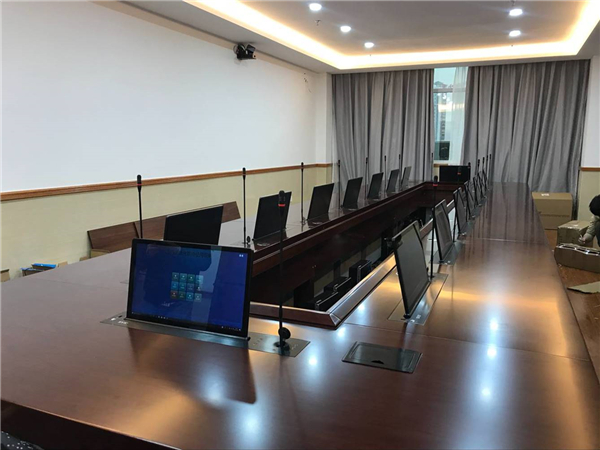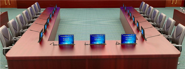 根據項目需求,我們為會場中部的17席位配備了SVS超薄高清液晶屏升降會議終端SV-LCD17(TD),作為無紙化會議的重要顯示及操作終端。當召開會議時,所有坐席的液晶屏可一鍵控制升起,方便參會人員配合使用無紙化系統,當會議結束或舉行普通會議時,液晶屏升降裝置將顯示屏降下自動隱藏,保持會議室桌面美觀整潔。