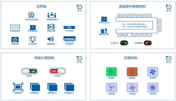 系統支持會議場景編程控制,包括一鍵系統開關,會議終端設備升降,以及對會議室燈光、空調、音視頻信號等進行集中控制,滿足自動化及智能化控制的設計需求。