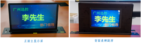 為方便與會人員對號入座和更輕松地認識彼此,我們為會場中部17個席位配置的雙面屏液晶升降器SV-LCD17(TD)具備電子桌牌顯示功能。其副屏固定顯示參會人員桌牌信息,主屏點擊觸摸后可進入無紙化系統主界面。桌牌內容可在后臺任意編輯,支持一鍵快速更新所有席位的桌牌信息。