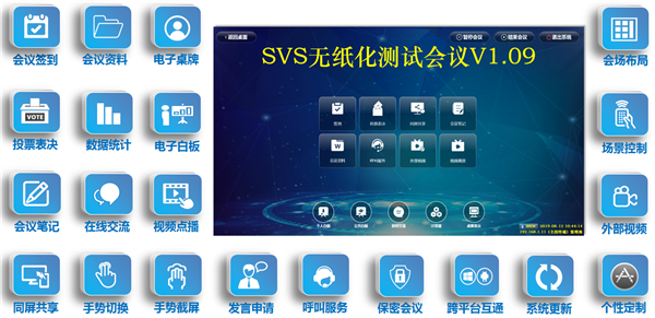 項目采用SVS無紙化會議系統,該系統運行于全千兆網絡環境,擁有強大的會議管理功能,包括多場會議信息的制定及發布、智能會議簽到、投票表決、會議資料共享和批注、會議同屏、會議筆記、電子白板及會場服務等。