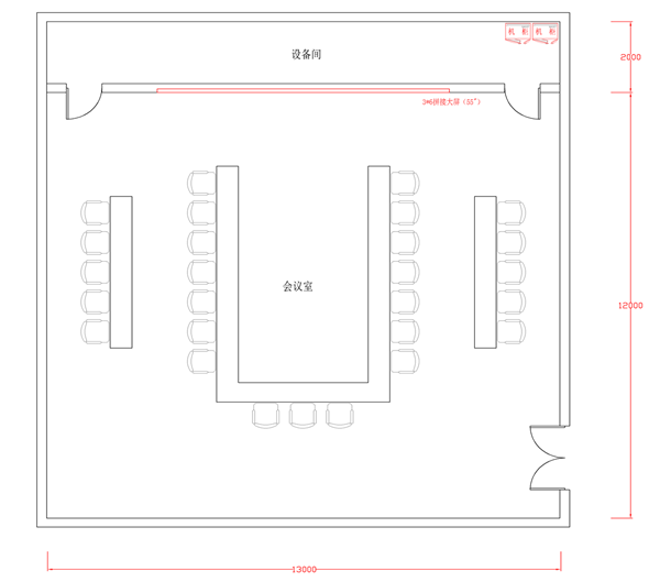 該會議室長12米,寬13米,高4米。整個會場共設計參會人員27席,全部席位均配備無紙化會議系統,其中可隱藏式PC會議終端17席(布置于會場中間)、平板電腦參會終端10席(布置于會場左右兩側)。另外配備液晶拼接大屏顯示系統、會議擴聲及發言系統、分布式智能控制系統等設備。