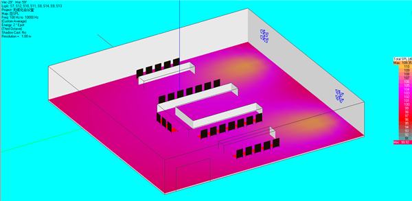 根據EASE專業聲場分析測量,本擴聲系統最大聲壓級達109dB,均勻覆蓋聲壓級也穩定在102dB-106dB,滿足了我們設計的需求并給系統留有余量。