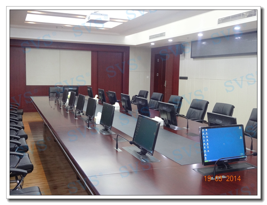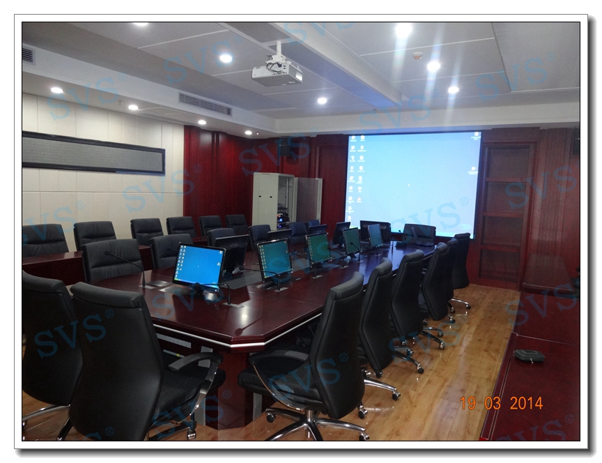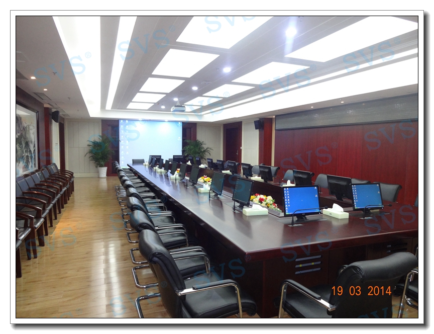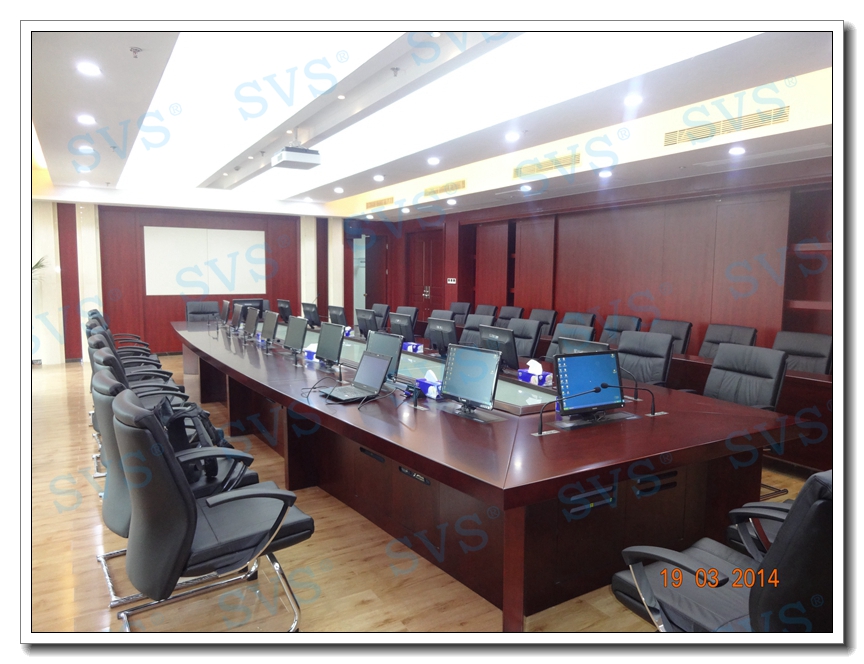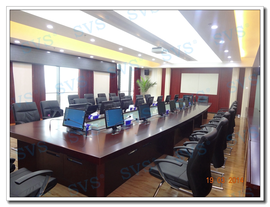 此次迅控SVS為湖北省某集團打造一個多媒體綜合項目,項目包括四個不同大小及用途的高級多媒體會議室,均采用無紙化會議模式打造,使用桌面顯示器隱藏器、桌面信息盒、桌面嵌入式數字發言系統,實現會議信息便捷化,有效提高會議效率。實現功能:各會場桌面顯示器根據會議需要,實現全升、全降、編組升降;實現會場投影機、顯示器等多路信息顯示管理;每個桌面信息盒可以提供電源、網線、音頻、視頻等輸入輸出,通過信息盒自帶按鍵即可輕松實現切換;項目圖片: