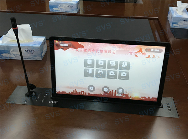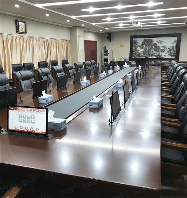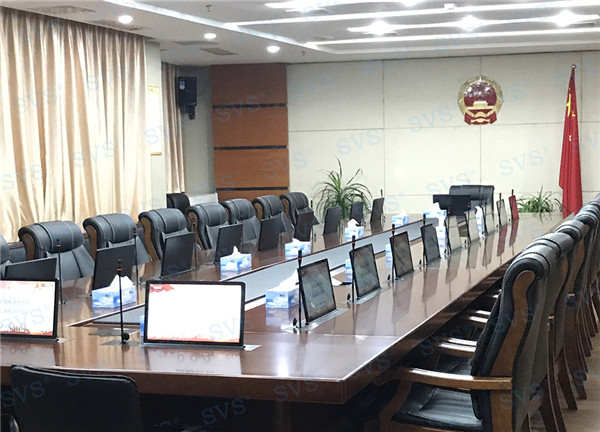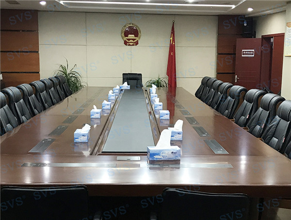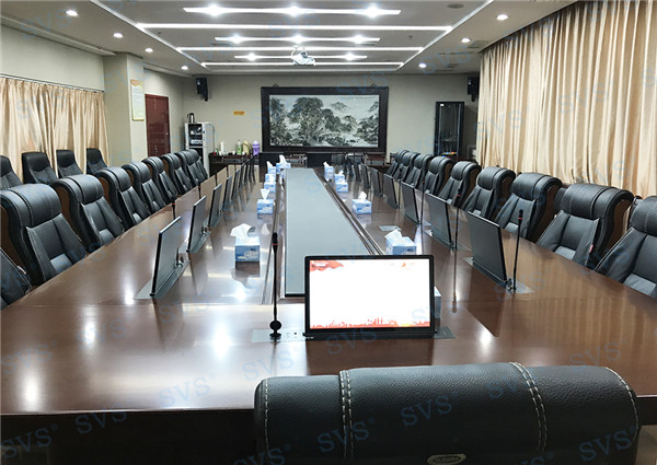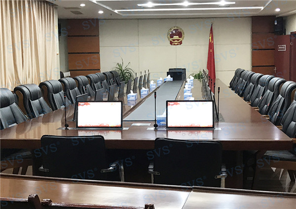 此次SVS為某市政府打造常務(wù)會(huì)議室。為客戶推薦使用帶話筒液晶屏升降器SV-LCD17(TS),該產(chǎn)品為超薄液晶屏與話筒升降一體機(jī),顯示屏和發(fā)言麥克風(fēng)均可獨(dú)立電動(dòng)升降,輕松實(shí)現(xiàn)普通會(huì)議、無(wú)紙化會(huì)議、多媒體會(huì)議等多種會(huì)議模式的切換。搭配E-L系列會(huì)議音箱,該產(chǎn)品采用高保真喇叭單元,中頻豐滿,人聲還原度極高,最終效果獲得現(xiàn)場(chǎng)一致好評(píng)。
