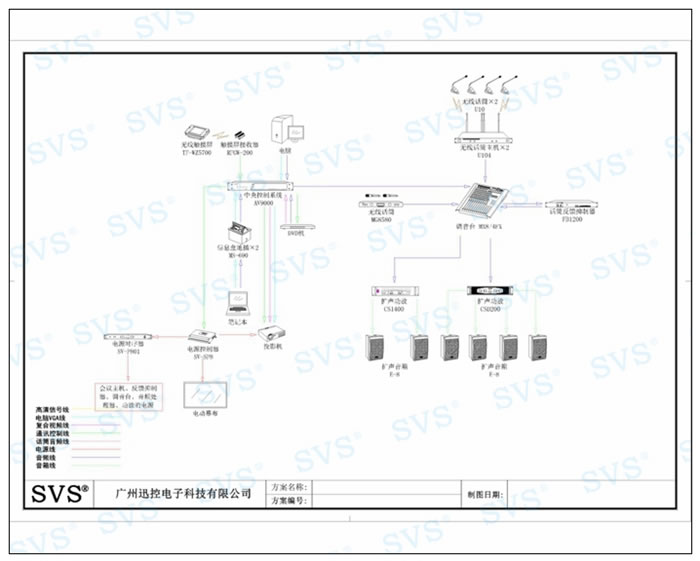 使用5.7寸無線真彩觸摸屏做為控制終端,真彩16色超大界面讓操控更加得心應手,操作界面可任意設計使之更加美觀、個性化。會場使用AV9000集中管理主機,自帶信號切換矩陣,及獨立強/弱電源控制器等,讓受控信號與強電分離,減少干擾,實現投影、設備、音量等智能化一鍵式控制,有效保證設備的穩定運行與使用壽命。