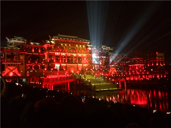 《烽煙三國》通過變化莫測、多層次立體交錯(cuò)的大場景水上舞臺(tái),立體逼真的3D全息式投影,360度環(huán)形移動(dòng)的觀眾席,氣勢恢宏的液壓式水下舞臺(tái),虛實(shí)交替的景觀呈現(xiàn),再融合歌、舞、雜技、武術(shù)等表演形式,將精彩動(dòng)人的故事、氣勢恢宏的史詩畫卷和美輪美奐的藝術(shù)效果完美結(jié)合,給觀眾帶來了前所未有的驚喜和震撼。觀眾通過水寨吊橋進(jìn)入觀演區(qū),演出時(shí)觀眾席180度移動(dòng)旋轉(zhuǎn),不僅讓觀眾感受到整個(gè)古建筑群的磅礴氣勢,還會(huì)體驗(yàn)到全國獨(dú)有的觀演方式。據(jù)悉,《烽煙三國》是全國同類演藝項(xiàng)目運(yùn)用舞臺(tái)機(jī)械類型最多、表演手法最多的。為大家呈現(xiàn)了三國文化的經(jīng)典橋段:桃園結(jié)義、身在曹營心在漢、過五關(guān)斬六將、水淹七軍。。。