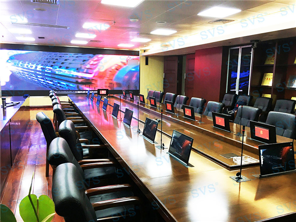 SVS為某集團打造無紙化會議室,會場共設18個席位。為客戶推薦使用雙屏升降器SV-LCD17TD+話筒升降器D3070A/B,輕松實現普通會議、無紙化會議、多媒體會議等多種會議模式的切換。