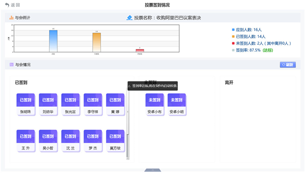10、支持實時會議簽到功能,簽到時大屏幕滾動顯示還未簽到的與會人員名單,并實時更新已簽到人數和未簽到名單;