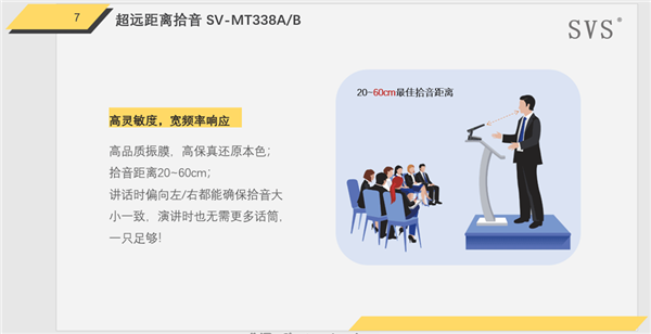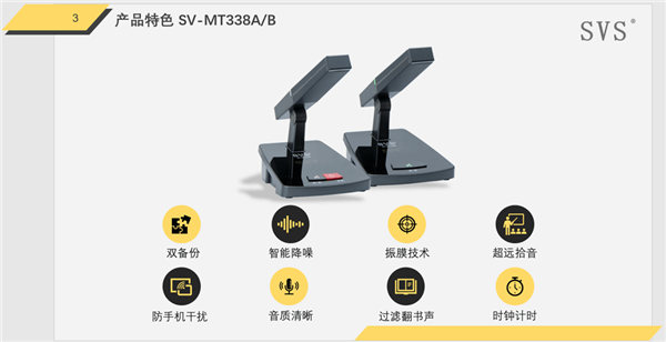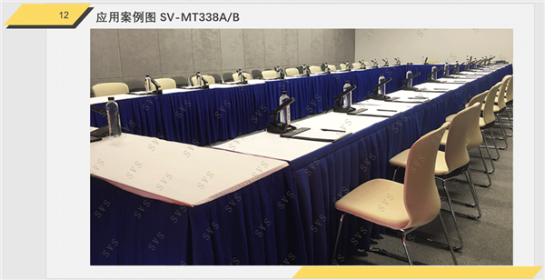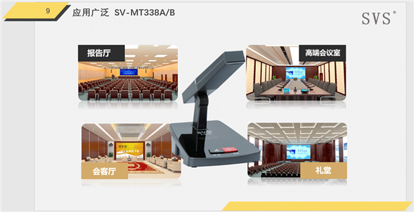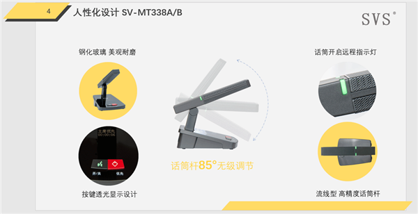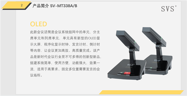 此款會議話筒是會議系統(tǒng)組網(wǎng)中的單元,分主席單元和列席單元,單元具有新型的OLED顯示大屏,程序化顯示時鐘、發(fā)言計時、倒計時等內(nèi)容,讓會議更加高效、高質(zhì)量完成。單元配置高檔進口咪芯,配合數(shù)字處理電路,展現(xiàn)高保真、高靈敏度、遠距離發(fā)言效果。咪桿采用超短鋁合金方管,美觀精致,時尚大方,搭配進口超心型指向咪芯,確保長期耐用無雜音。另外單元還具有自動攝像跟蹤、多模式控制、自動關(guān)機等功能。該產(chǎn)品是新時代會議行業(yè)里不可多得的創(chuàng)新型新品,組建系統(tǒng)簡單,使用方便,功能強大,效果一流,適用于高要求、固定多位置需要發(fā)言的會議場所。