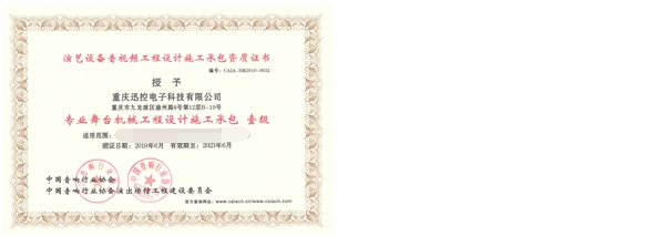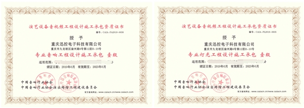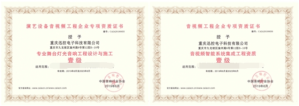 公司擁有雄厚的技術實力,先后獲得 “國家高新技術企業” 證書;獲得ISO9001質量管理體系認證、ISO14001環境管理體系認證、OHSAS18001職業健康與安全管理體系認證證書;獲得“中國音響行業協會:CAIA20150162專業舞臺燈光音響工程設計施工壹級資質”“中國音響行業協會:CAIA20150163音視頻智能系統集成工程資質壹級資質”“中國音響行業協會:CAIA-PA2015-0102專業音響工程設計施工承包壹級資質”“中國音響行業協會:CAIA-PA2015-0091專業燈光工程設計施工承包壹級資質”“中國音響行業協會:CAIA-PA2015-0076專業舞臺機械工程設計施工承包壹級資質”證書。