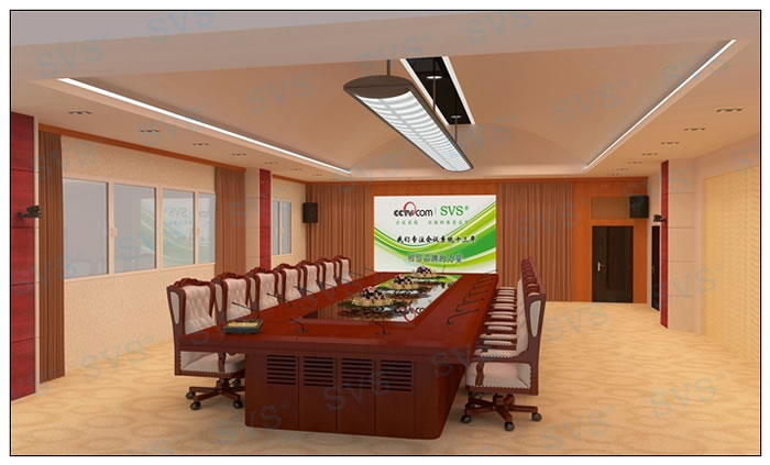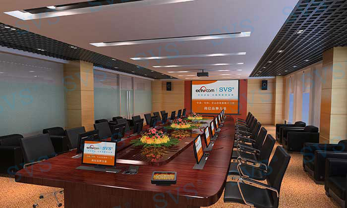 會議顯示使用120寸電動幕布,方便隱藏不影響整體美觀度,一鍵聯動功能讓會議更智能化。以及每一位與會人員配置19寸多媒體液晶顯示器,更加方便相互間信息共享交流,隱藏式安裝,桌面更加整潔、大方。