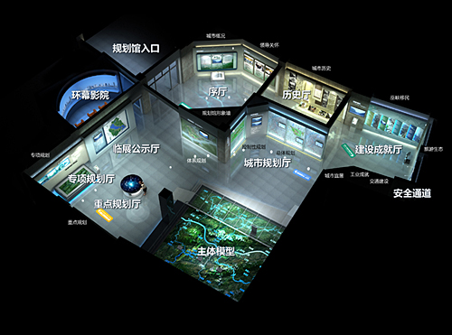 藝術化設計手法。規劃展廳中的信息容量大、內容龐雜而繁多,重慶迅控運用藝術化的表現手法,將大容量的信息融入到布展環境當中,包括展陳手法、展臺、墻面等每一個小細節當中,讓規劃內容在展廳每一個角落中都有體現。流線型、圓形、橢圓形等空間設計均應用其中,結合多媒體展示裝置藝術,讓規劃展廳充滿藝術靈動感。