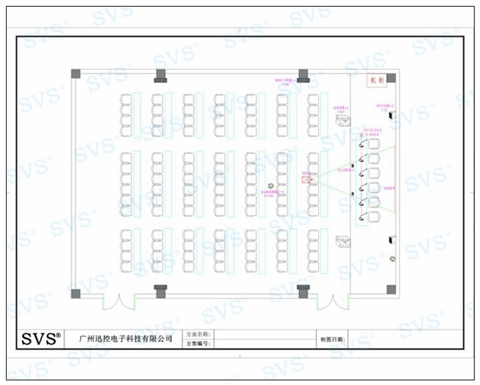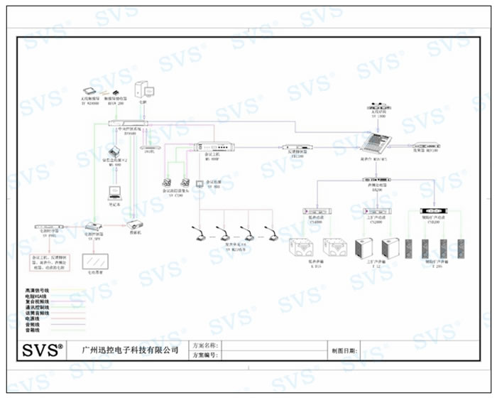 使用8寸無線真彩觸摸屏做為控制終端,真彩24色超大界面讓操控更加得心應手,操作界面可任意設計使之更加美觀、個性化。會場使用AV9500集中管理主機,信號切換矩陣,及獨立強/弱電源控制器等,讓受控信號與強電分離,減少干擾,實現投影、設備、音量等智能化一鍵式控制,有效保證設備的穩定運行與使用壽命。
