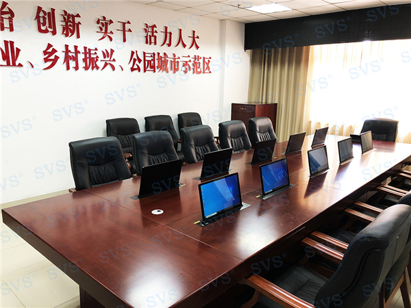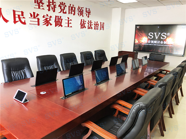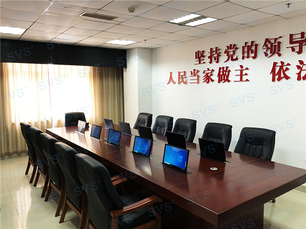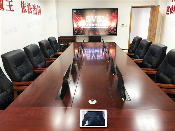 此次SVS為某市人大會議室打造無紙化會議室,會場共設10個席位,為每個席位配置了液晶屏升降器SV-LCD17,配合無紙化軟件,提供了強大的會議管理功能,為與會人員提供一個多功能、全方位、保密性的無紙化會議平臺。無紙化系統配合會議平板顯示系統,可實現日常辦公、遠程視頻會議等多種功能,整體效果獲得現場一致好評,得到了業主方的高度肯定!