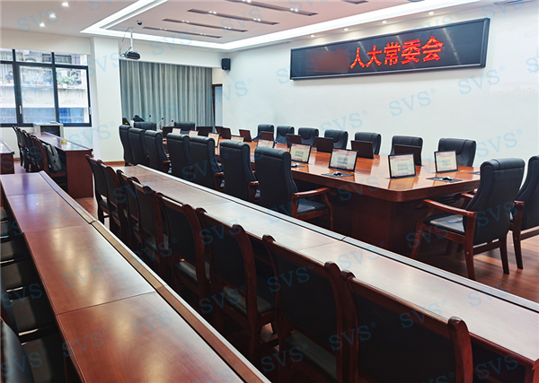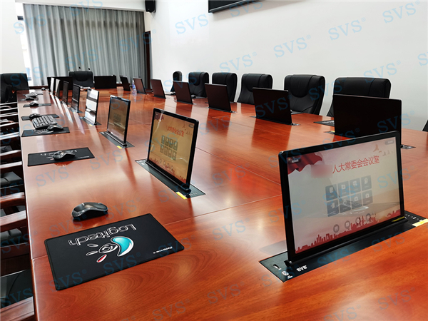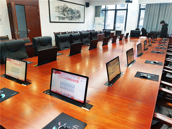 此次SVS為某人大常委會打造無紙化會議室,為客戶推薦使用液晶屏升降器SV-LCD17,配合專業無紙化服務器SV-MP200B,此款服務器核心程序采用無人值守模式,開機后臺自動運行;支持應用服務、消息服務和媒體服務監控功能;支持系統管理功能、人員管理功能、建立會議界面、會議資料管理功能、會議投票等功能。輕松提高會議效率,打造出一個具有先進性和實用性的環保高效的數字無紙化會議室。