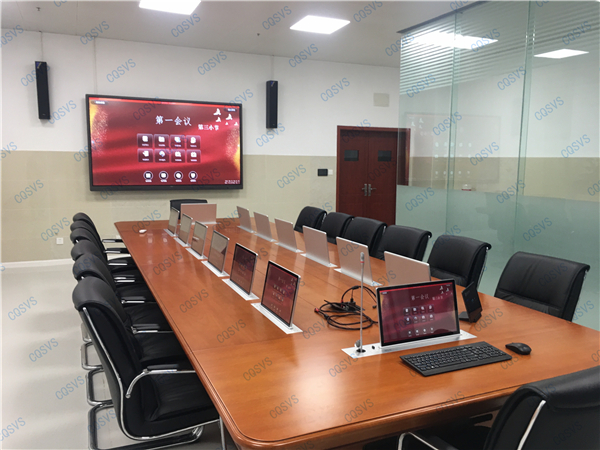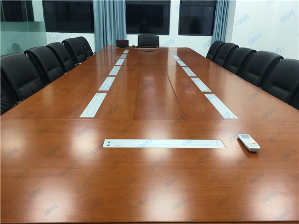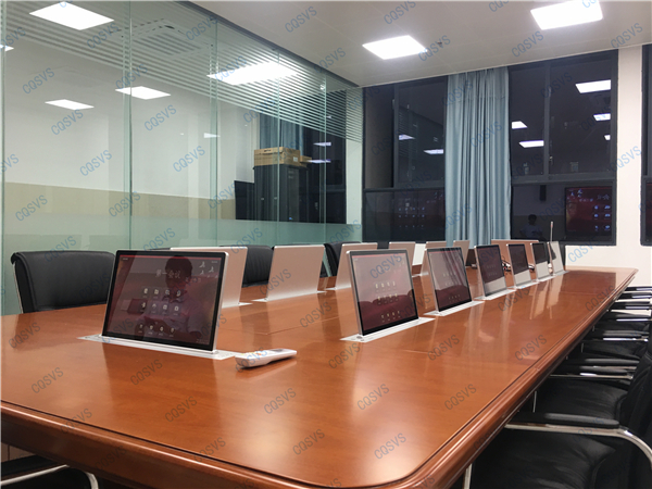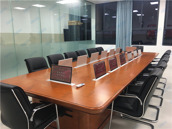 近期,重慶迅控電子科技有限公司為某高校打造無紙化會議室,根據會場實際情況以及用戶需求提供了一套智能無紙化會議室解決方案。會場主席位采用 SV-LCD17(TS)帶話筒液晶升降器;其他13個參會端采用液晶屏升降器SV-LCD17(T),產品標配內嵌式17.3英寸全高清電容觸摸屏,支持10點觸摸,即插即用,顯示屏支持0-30°后仰調節,支持自動復位。該產品是新時代無紙化會議或者視頻會議室的主流產品,配合無紙化軟件,可以實現眾多會議功能,是與會人員之間信息化交互的重要工具。