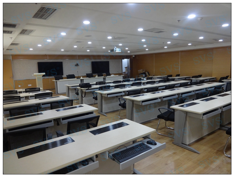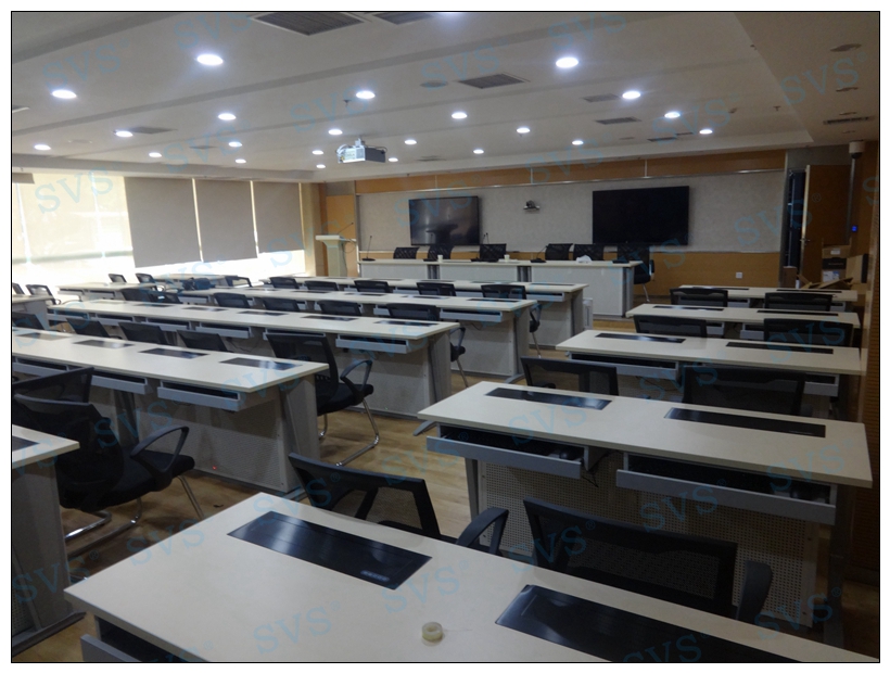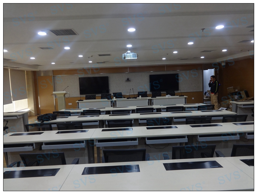 此次迅控為重慶市江津供電公司打造應急指揮中心,中心可同時容納70人進行會議,每個席位都配有獨立的桌面顯示隱藏設備,可在需要時同步或異步使用顯示器,并智能的控制顯示信號,配合現場的雙投影顯示,構成指揮中心多媒體顯示系統;通過中央控制系統實現對整個會場的數字化控制,包括環境控制、顯示控制、設備電源控制、會場聲音控制、會議模式控制等功能;為用戶打造出一個數字化的智能應急指揮中心。
