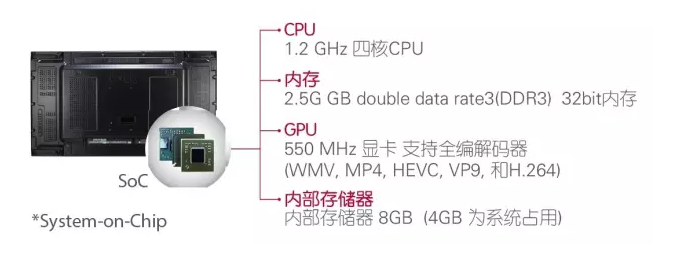 VM5B內置高性能四核Soc,支持播放多種格式的視頻文件,無需額外的媒體播放器,并且能夠實現每臺顯示器的同步播放而沒有延遲,其內部存儲器容量達到8GB,能夠存儲大量影視、音頻、圖片等素材,更擁有550MHz顯卡,支持全編解碼器。內置WebOS智能平臺提供方便快捷的內容創建工具,LG的SDK和技術支持使內容建設和維護更為簡單。LG VM5B智能平臺,不僅保障了拼接墻的統一完整性,更是減少了用戶的使用成本與投入精力。