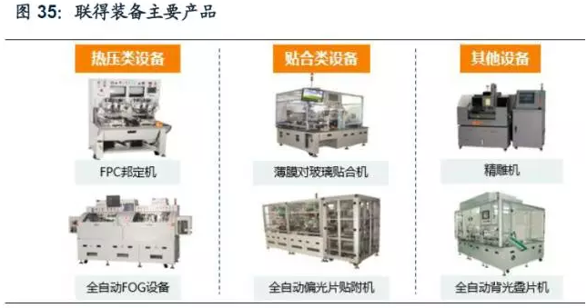 聯得裝備生產設備面廣,覆蓋模組組裝環節。公司的主營產品為平板顯示器及相關零組件生產設備,包括TFOG連線機、全自動COG、全自動FOG、ACF粘貼機、FPC邦定機等熱壓類設備以及OCA全自動全貼合機、玻璃對玻璃貼合機、薄膜對玻璃貼合機、水膠貼合機、軟膜貼合機等貼合類設備,其中貼合設備產品涉及的全貼合技術以及全自動FOG系列產品的自動預壓、本壓工藝在行業中處于優勢地位,得到客戶廣泛認可。