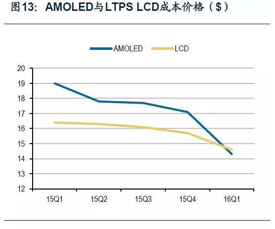 在成本方面,隨著技術的逐步完善,AMOLED的成本也大幅下降,貼近LCD。根據IHS數據,在2016年第一季度,5.0寸1080p AMOLED屏每塊面板成本僅14.3美元,LCD則需要14.6美元,而在2015年第四季度,這兩項數字分別為17.1美元和15.7美元。