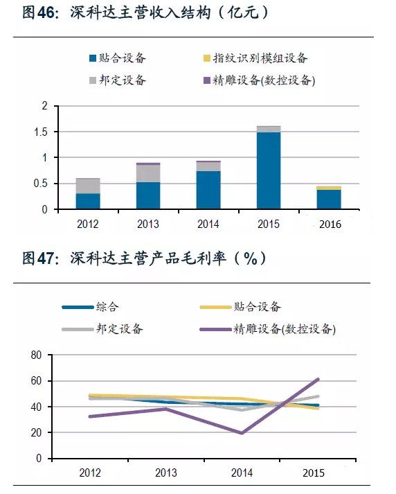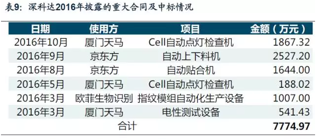 2016年獲得的重大合同中,自動檢測AOI智能設備(Cell自動點燈檢查機)與電性測試設備(自動CTP檢查機、自動OTP燒錄檢查機、貼合自動CTP檢查機),都為公司新研發產品,知名企業天馬微電子的使用,印證了深科達的研究能力與新產品的質量。與京東方簽訂的自動貼合機合同中,設備將用于京東方第6代TFT-LCD生產線柔性化轉型技改項目,說明公司在接下來可期的顯示面板生產線技術改造項目中會受益。
