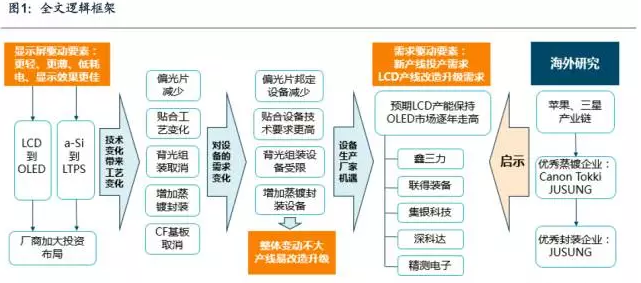 顯示技術的變化會帶來制作工藝上的變化。第二部分詳細闡述了面板制作的三個制程(Array、Cell、Module)并指明每個制程上工藝和的變化:偏光片減少、貼合工藝改變、背光模組取消、CF基板取消、增加蒸鍍封裝工藝。工藝上的變化就會帶來使用設備的需求變化:偏光片邦定設備需求減少、貼合設備技術要求更高、背光組裝設備不再需求、蒸鍍封裝設備增加。在詳細分析下也得出:LCD到OLED的制作流程變化不大,產線易進行改造升級。