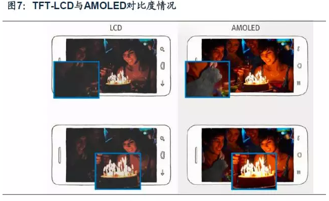 AMOLED具有更高的對比度。TFT-LCD的背光層不能夠完全關閉,漏光現象的存在會影響顯示畫面的對比度。而AMOLED屬于主動式發光,沒電流通過時其亮度可以為零,擁有很高的對比度。測試表明,AMOLED的對比度高達13000000:1,足夠正確的表現圖片的明暗,賦予生動的現實感,特別是在夜間拍攝,差異更為明顯。