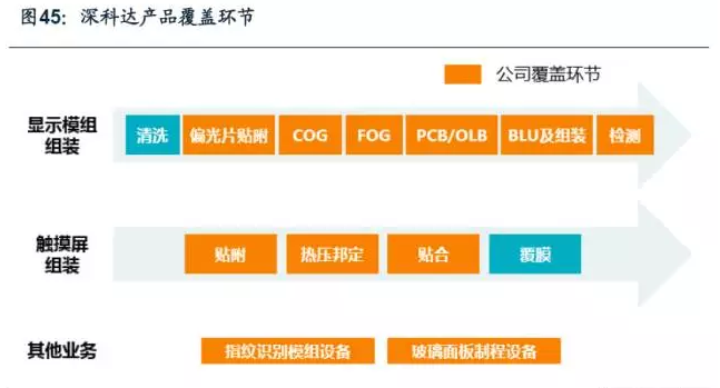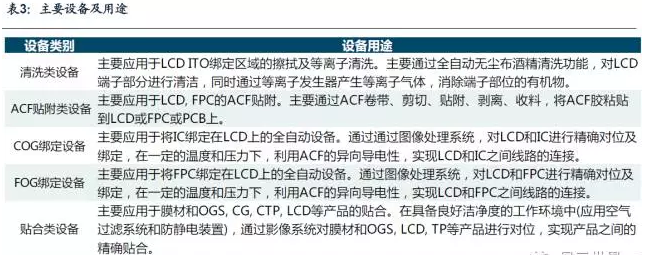 新產線的投資加之已有產線的升級改造帶來對多種設備的需求,主要有:清洗類設備、ACF貼附類設備、COG邦定設備、FOG邦定設備、貼合類設備及AOI檢測設備等。