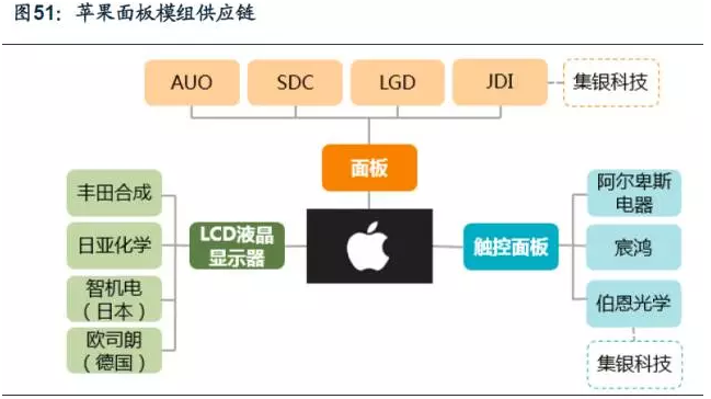蘋果和三星產品是消費電子行業的風向標,一旦采用某種技術,其他手機廠商便會跟隨應用推出新產品。對于中上游廠商來講,進入蘋果或三星的供應鏈,也充分證明了企業的實力。目前,蘋果、三星在面板模組設備的供應鏈上的廠商以日、韓、臺企為主。