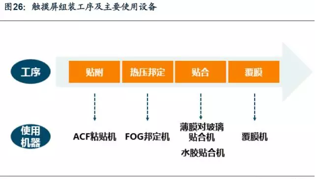 如今中小顯示屏面板,觸控功能的實現是通過觸摸屏模組和顯示屏模組的組裝。觸摸屏一般由觸控感應器和玻璃蓋板構成,其生產過程也可以分為三個階段:觸控感應器工序、玻璃蓋板工序、模組組裝工序。觸控感應器工序是指觸控感應器的制作過程;玻璃蓋板工序是蓋板的加工過程;模組組裝工序則是將觸控感應板和玻璃蓋板組裝形成觸摸屏的過程,主要生產工序包括貼附、熱壓、貼合、覆膜等。根據原材料的不同,貼合工藝可分為薄膜對玻璃貼合、玻璃對玻璃貼合、水膠貼合等類別。