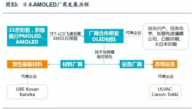 日本對OLED研究較早,近十幾年的發展過程中,涌現出一批優秀的企業,Canon-Tokki就是其中之一。在發展階段初期,有大量日本廠商進行OLED研究,雖然索尼第一家量產AMOLED面板,但由于TFT-LCD的迅速發展而致使OLED收到沖擊沒能普及。隨后日商聯合研制OLED材料,并開發多種其他顯示器件技術。如今,日本廠商在材料和設備上都世界領先,韓廠面板一些關鍵設備材料都從日本采購。