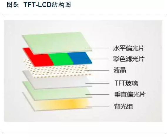 從原理上看,TFT-LCD(Thin Film Transistor- Liquid Crystal Display,薄膜晶體管液晶顯示)是利用液晶的光電效應,通過薄膜晶體管(TFT)電路控制液晶單元的透射率及反射率,從而產生不同灰階的一種平板顯示技術。由于液晶材料本身并不發光,因此TFT-LCD是一種被動發光型顯示,需要背光源。背光模組產生白色背光,通過偏振片轉換成震動方向統一的線偏光,之后再通過TFT及液晶分子層。根據TFT層產生的不同電壓,液晶分子層會有不同的扭轉角度,從而對線偏光進行極化,對震動方向進行扭轉,然后通過濾波片產生不同的顏色,最后通過第二層偏振片(與第一層垂直),實現對光強的控制,最終通過紅綠藍三種不同顏色的光的強弱組合實現不同的顏色及灰階。