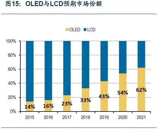 在智能手機市場,2020年OLED有望超越LCD成為主流。2016年第三季度,AMOLED面板出貨量達到9600萬片,同比增長148%,環比增長103%。根據UBI Research預測,市場上對OLED的需求將持續增長,在智能手機市場,OLED占比逐年提高,預期從2016年的16%增長至2021年的62%,于2020年超越LCD;用于智能手機的AMOLED面板預期從2016年的3.58億片增長至2020年的14.08億片,年均增長41%。