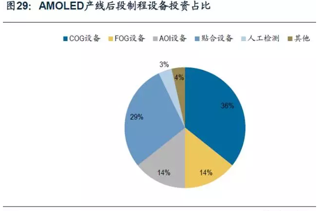 目前在建AMOLED生產線有5條,擬建5條,總投資達2687.28億元。其中,除華星光電擬建的11代線用于生產大尺寸屏外,其他9條線均用于生產中小尺寸屏。對生產線的投資中,后段制程大概占30%,后段制程中的設備投資占后段制程投資的20%-30%,未來三年AMOLED的后段制程設備的市場容量約為161-242億元。