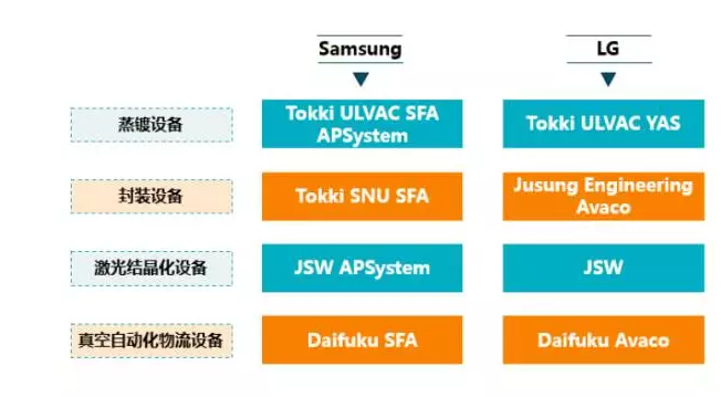 實現蒸鍍工藝的設備是蒸鍍機,除日商Canon-Tokki在蒸鍍設備上絕對領先外,ULVAS、SNU等廠商也有一定出貨量。蒸鍍工藝形成較大技術壁壘是由于在良度提升上的憂慮。目前,已量產AMOLED都是使用Canon-Tokki的設備,使用其他廠商的設備,無法保證良率提升情況并易經歷一個漫長的良率提升過程。實現封裝工藝的是封裝機,目前韓廠、日廠都能出產相關設備。