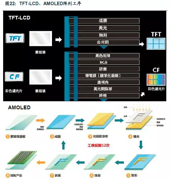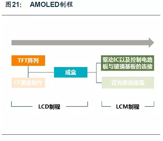 相較TFT-LCD,AMOLED沒有CF基板制作和背光模組組裝兩個部分。下面,我們從三個階段分別解讀從TFT-LCD到AMOLED的工序變化以及帶來的設備需求的變化。