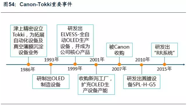 Canon-Tokki是一家集研發、生產、銷售為一體的設備制造商,主要產品為OLED顯示器相關生產設備以及真空處理設備,具體包括蒸鍍機、薄膜電池生產設備等。1999年,公司就研發出包含沉積、封裝一系列工序的OLED大批量生產系統,為日本、韓國、臺灣的面板廠商供貨。