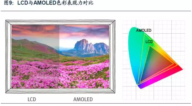 AMOLED具有更寬的色域。AMOLED的色域寬度大概是TFT-LCD的1.4倍,能夠更好地體現大自然的顏色。雖然LCD采用的也是標準的RGB色階,然而,AMOLED可以在更大范圍內控制單個子像素,因此可以通過主色的混合生成更寬的色域。AMOLED的高亮度和寬色域也使其在戶外強陽光反射下依然具有鮮明的畫質,具有更高的戶外可讀性。