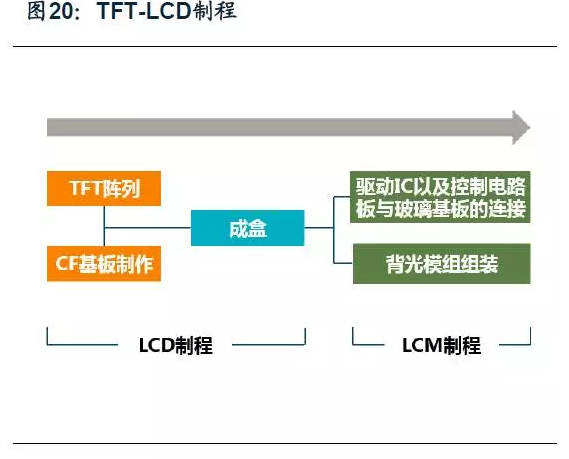 面板的制造過程可分為三大階段: 前段陣列工序(Array), 中段成盒工序(Cell)以及后段模塊組裝工序(Module)。對于TFT-LCD來講,前段的陣列制程是將薄膜晶體管制作于玻璃上。中段的成盒,是以前段TFT陣列的玻璃為基板,與彩色濾光片的玻璃基板結合,并在兩片玻璃基板間滴上液晶后貼合,再將大片玻璃切割成面板。后段模塊組裝制程, 是將成盒工序中貼合并切割后的面板玻璃, 與其他組件如背光板、電路、外框等多種零組件組裝的生產作業。