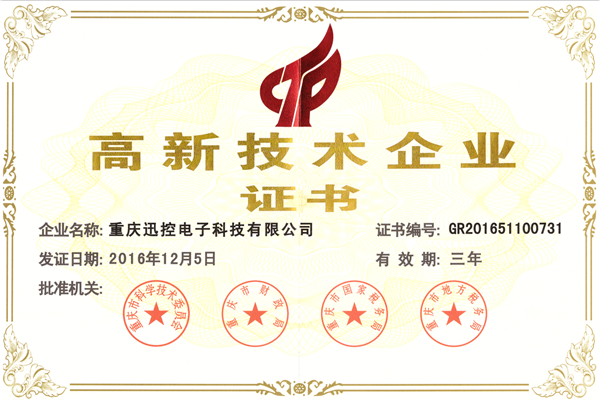 依據(jù)科技部、財(cái)政部、國(guó)家稅務(wù)總局《高新技術(shù)企業(yè)認(rèn)定管理辦法》、《高新技術(shù)企業(yè)認(rèn)定管理工作指引》的規(guī)定,在2016年國(guó)家高新技術(shù)企業(yè)評(píng)選活動(dòng)中,經(jīng)重慶市科學(xué)技術(shù)委員會(huì)、重慶市財(cái)政局、重慶市國(guó)家稅務(wù)局及重慶市地方稅務(wù)局專(zhuān)家的層層評(píng)審,重慶迅控電子科技有限公司最終喜獲由其聯(lián)合頒發(fā)的“高新技術(shù)企業(yè)證書(shū)”(證書(shū)編號(hào):GR201651100731)。