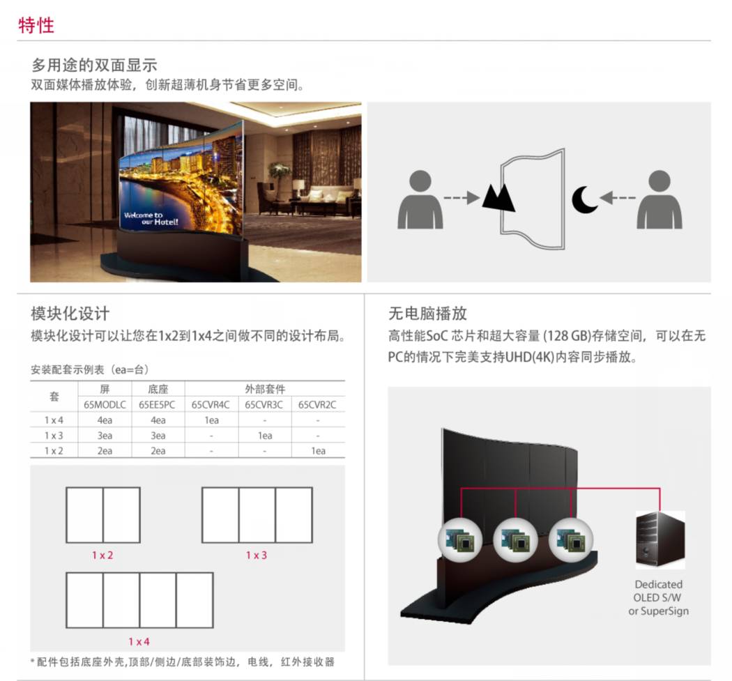 據LG研發工作人員介紹,LG目前發布的OLED顯示屏新品全部為韓國進口,以保證產品的質量可靠性 。9月份即將上市的四款數字標牌顯示屏新品是由3款OLED顯示屏和1款超寬液晶顯示器,分別為:液晶產品是88英寸超寬數字標牌顯示器88BH7D,其他3款OLED產品為--玻璃一體化OLED顯示器55EG5CD/SD、65寸平面拼接顯示器65EV5C以及雙曲面波浪形拼接顯示器65EE5PC。