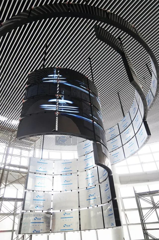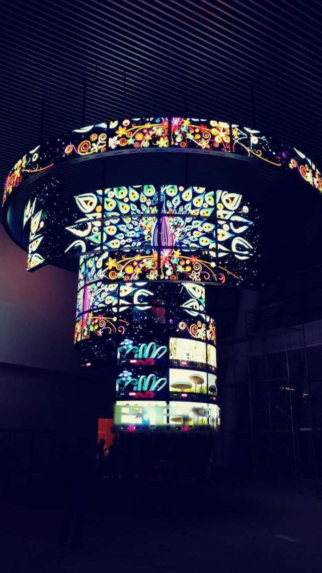 LG 55EF5C是一款開(kāi)放型的OLED曲面拼接顯示器,利用OLED柔性屏幕的特點(diǎn),具有向外凸顯和向內(nèi)凹陷的兩種造型,可以滿足客戶更多的創(chuàng)意設(shè)計(jì)。華數(shù)產(chǎn)業(yè)園項(xiàng)目正是看中了 LG 55EF5C的這個(gè)特點(diǎn),通過(guò)LG打造出一個(gè)強(qiáng)大而震撼的信息發(fā)布平臺(tái),在國(guó)內(nèi)獨(dú)占風(fēng)頭。整個(gè)造型分為3層環(huán)形,最大半徑為4.5米,最小半徑為2米,錯(cuò)落有致的拼裝十層屏幕。而OLED兩層結(jié)構(gòu)的輕薄機(jī)身,僅用最低限度的支撐便可懸掛于天花板上,整體造型既輕盈而又充滿了科技感。同時(shí),該項(xiàng)目利用LG特有的webOS系統(tǒng),實(shí)現(xiàn)整體拼接屏幕視頻內(nèi)容的同步播放,方便管理的同時(shí)有效降低采購(gòu)成本和運(yùn)營(yíng)成本。