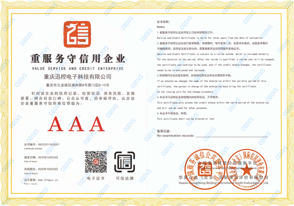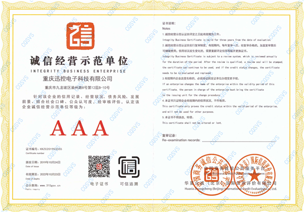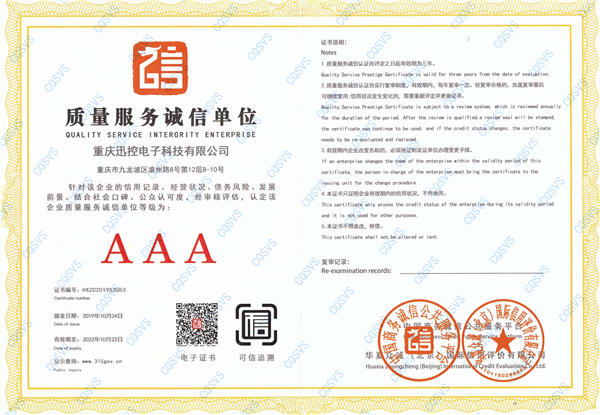 熱烈祝賀重慶迅控電子科技有限公司喜獲“企業信用評級AAA級信用企業”,包含“誠信經營示范單位AAA”“企業信用等級AAA”“企業資信等級AAA”“質量服務誠信單位AAA”“重服務守信用企業AAA”“重合同守信用企業AAA”“重質量守信用單位AAA”7個AAA評級。