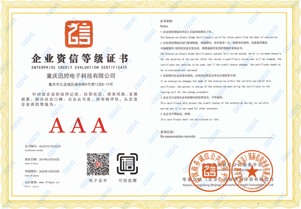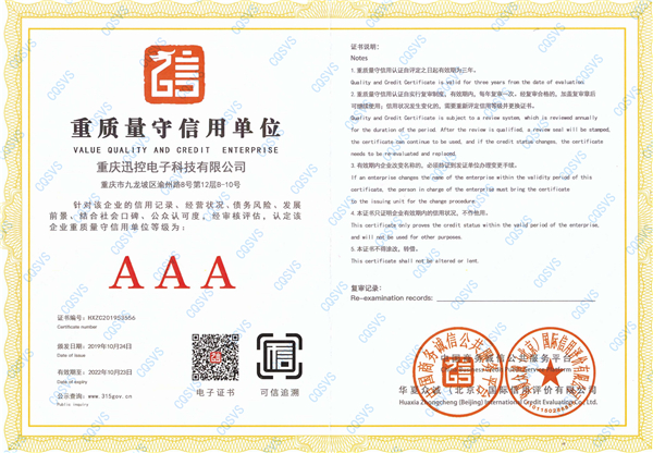 近一個月來,通過相關權威機構對我司的資本實力、人力資源管理、資質認證、品牌建設、技術研發能力、售后服務、賬款管理、信用風險管理、歷史評級和履約狀況、社會信用記錄及財務報表等方面的信用狀況及信用能力進行綜合性調查評審和復核,最終授予重慶迅控電子科技有限公司為“企業信用評級AAA級信用企業”。