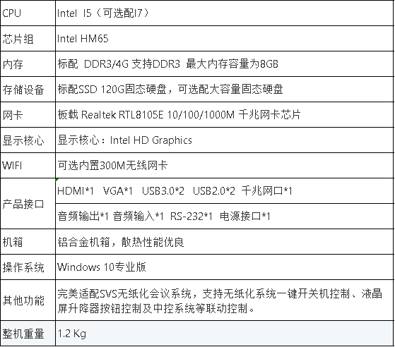 無紙化會議終端電腦,采用迷你機箱設計,性能高效穩定,散熱優良,固態硬盤,啟動迅速,內置千兆網卡,完美適配SVS無紙化會議系統,支持無紙化系統一鍵開關機控制、液晶屏升降器按鈕控制及中控系統等聯動控制。