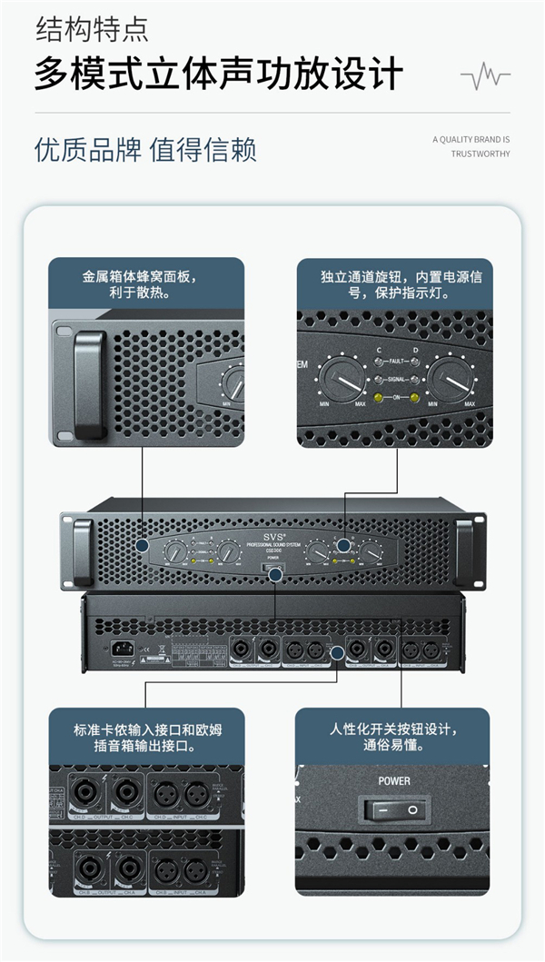 雙立體聲四通道專業(yè)功放,每個通道均支持獨立音量調(diào)節(jié);