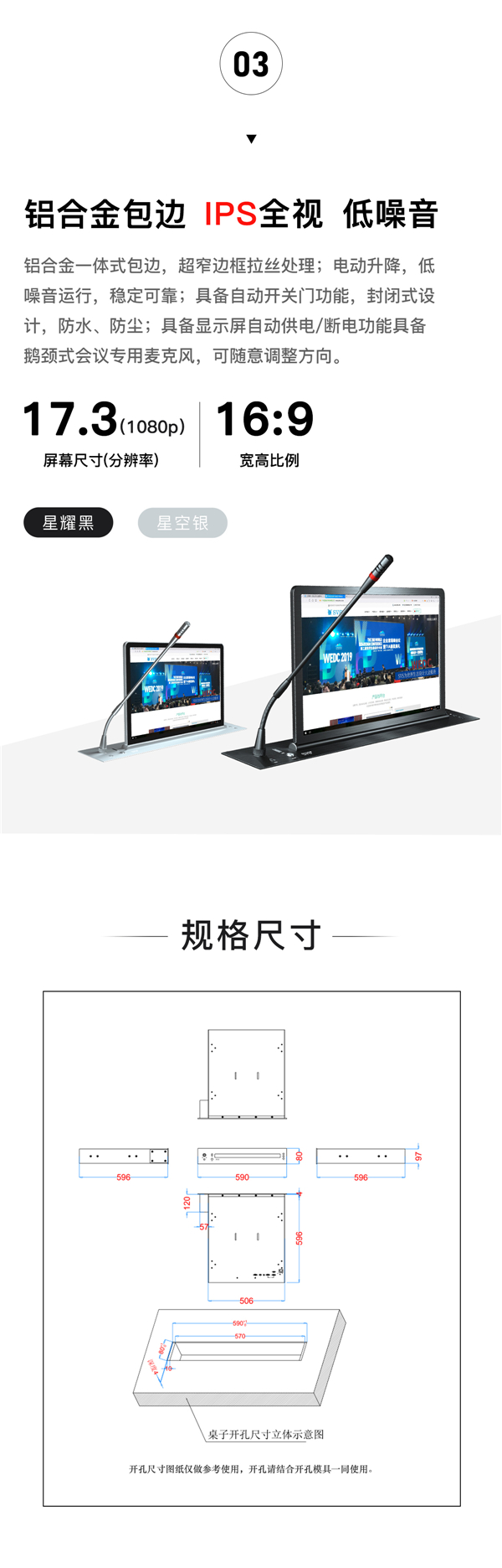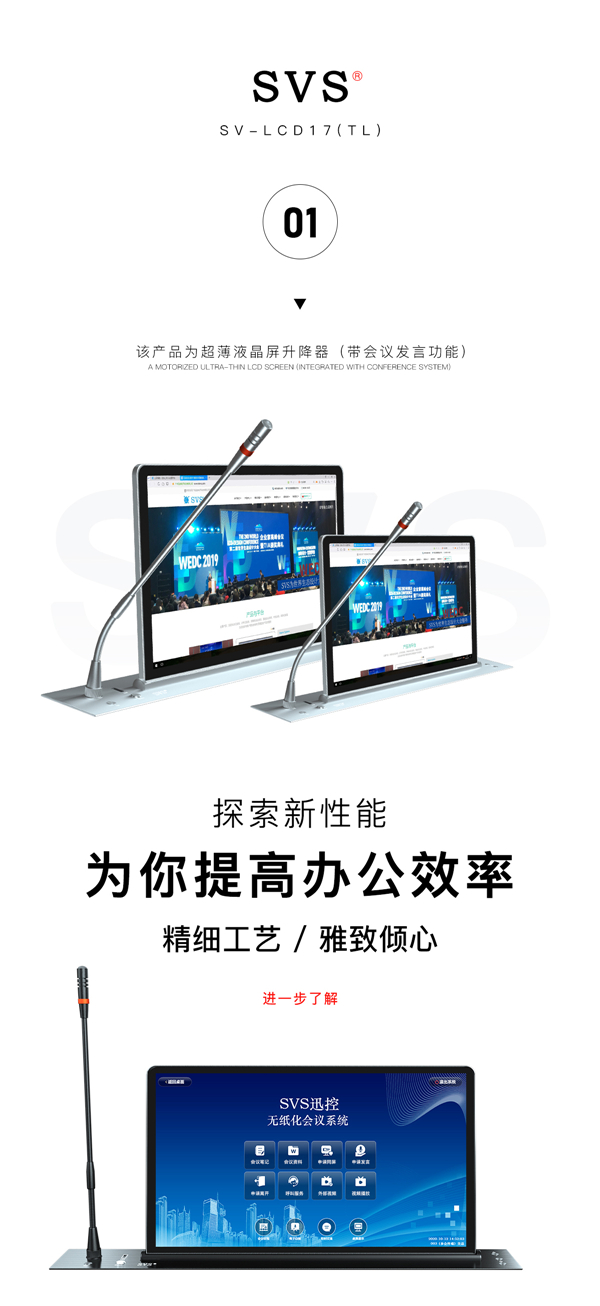 主面板采用鋁合金拉絲處理,帶有顯示屏升降停控制按鈕和麥克風(fēng)開關(guān)按鈕;