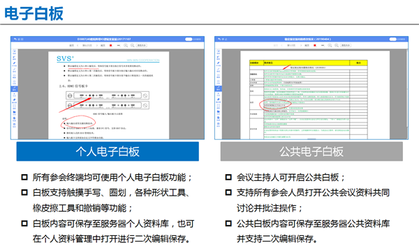 支持電子白板功能,普通參會者可使用個人白板,并將內(nèi)容保存至個人資料庫,會議主持人可開啟公共白板,對會議文件進行同步編輯,共同手寫、批注;