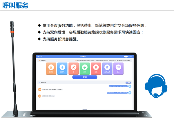 支持會議服務(wù)功能,如發(fā)送茶水、紙筆、技術(shù)支持等請求,雙向反饋,快速響應(yīng);
